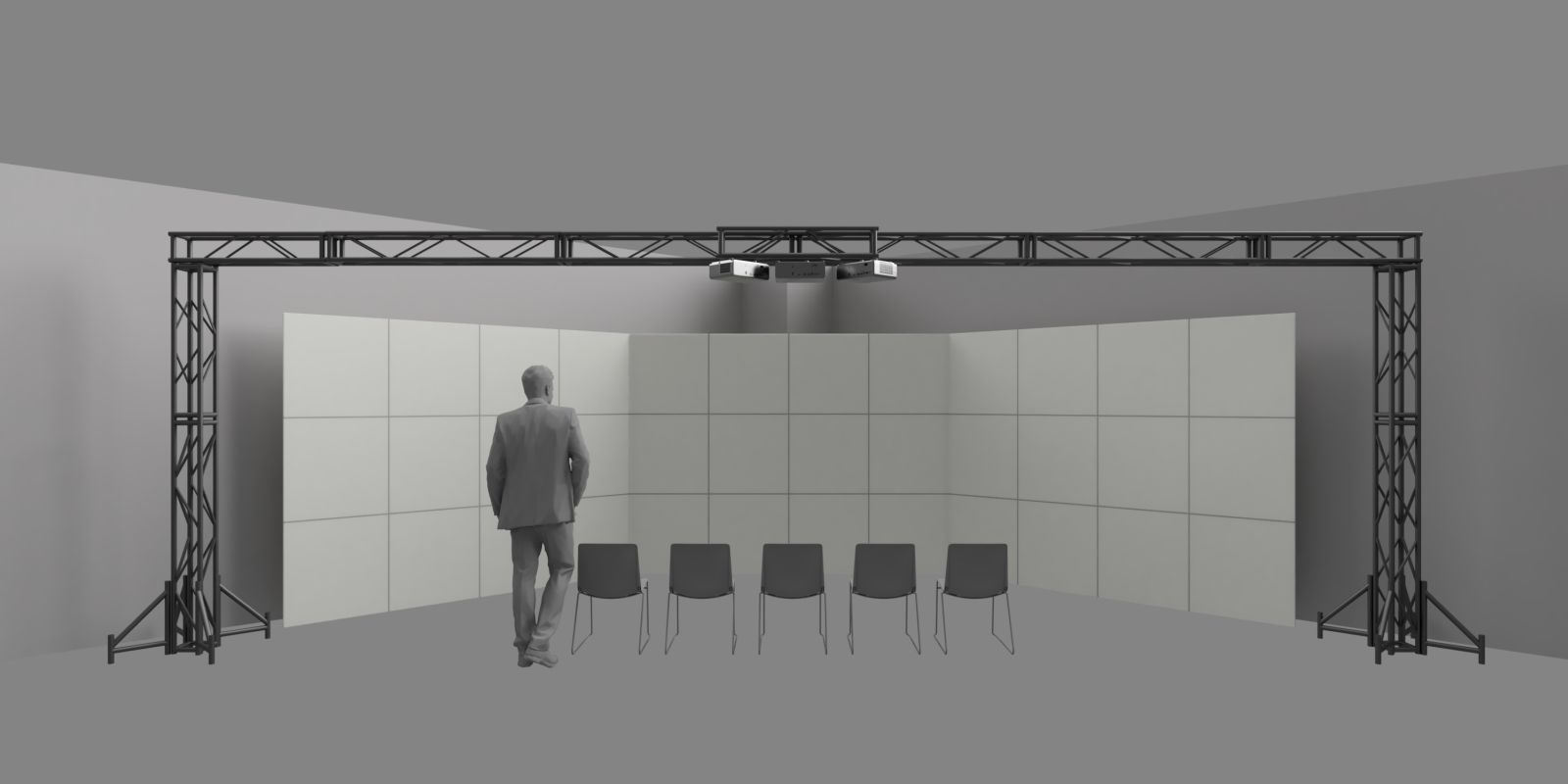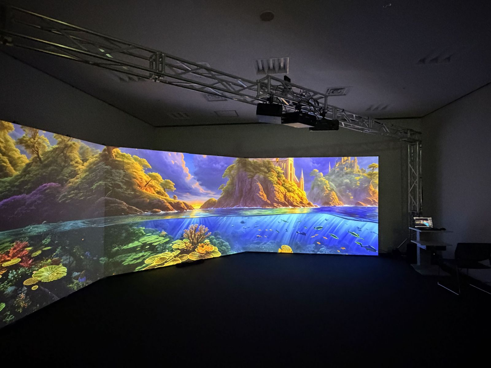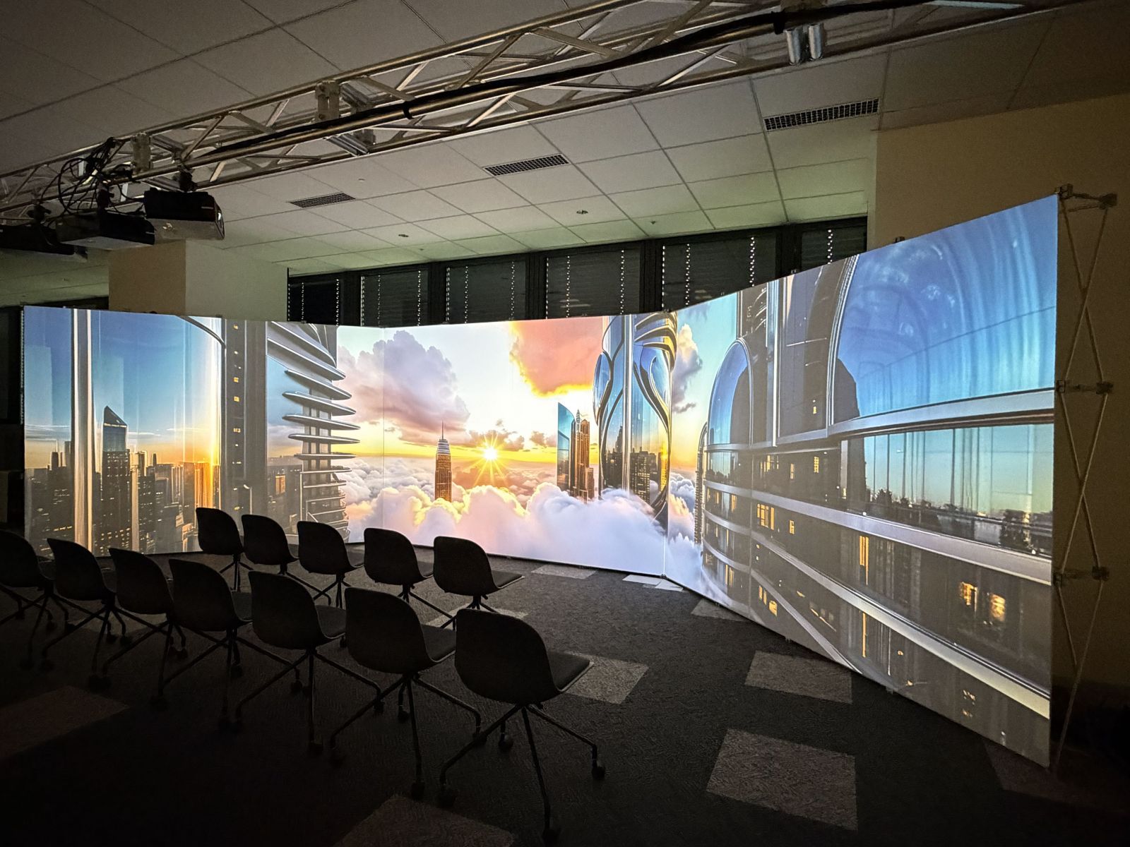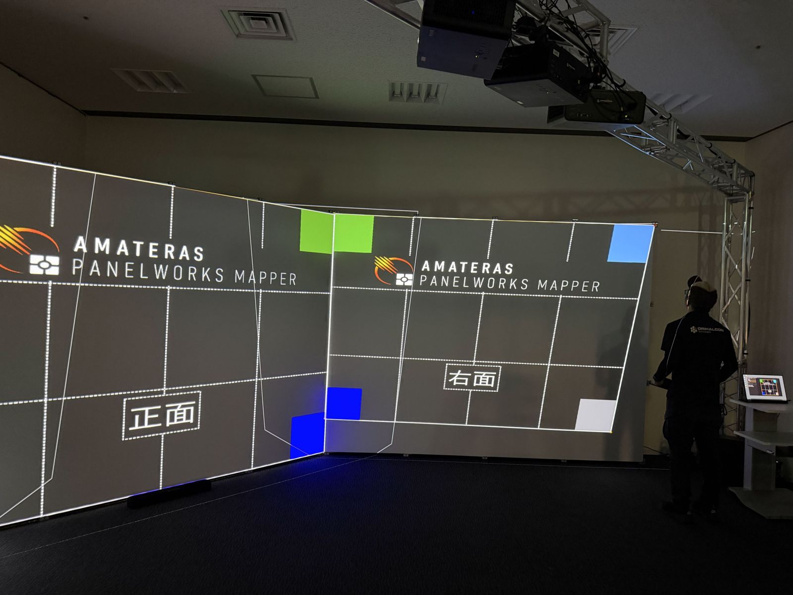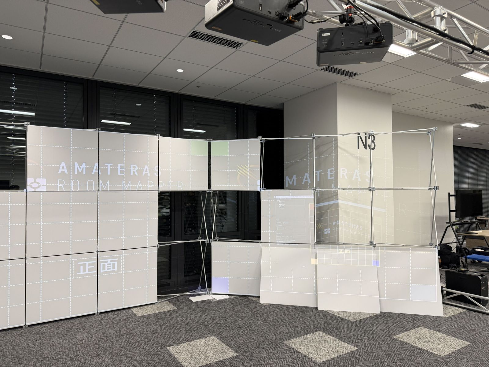 「簡単、手軽な3面スクリーンイマーシブシアター構築キット」をコンセプトにした新製品「Panelworks(パネルワークス)」の提供を開始いたしました。これまでになかった、必要に応じてDIYでも構築できる可搬型のイマーシブシアターソリューションです。一般的な天井高の会議室や教室、展示場などの室内空間に3面スクリーンを展開し、多人数で同時視聴が可能な広視野映像空間を構築できます。イベントや巡回展示、デモンストレーションなど、幅広い用途に御活用いただけます。