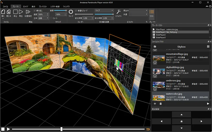 Amateras Panelworks Playerは、可搬型イマーシブシアター構築キット「Panelworks」専用のイマーシブ映像再生ソフトウェアです。こちらで配布している無償版は、Panelworks向けコンテンツ制作のプレビュー、提案プレゼン用の資料作りのほか、運用方法の事前確認などにご活用いただけます。