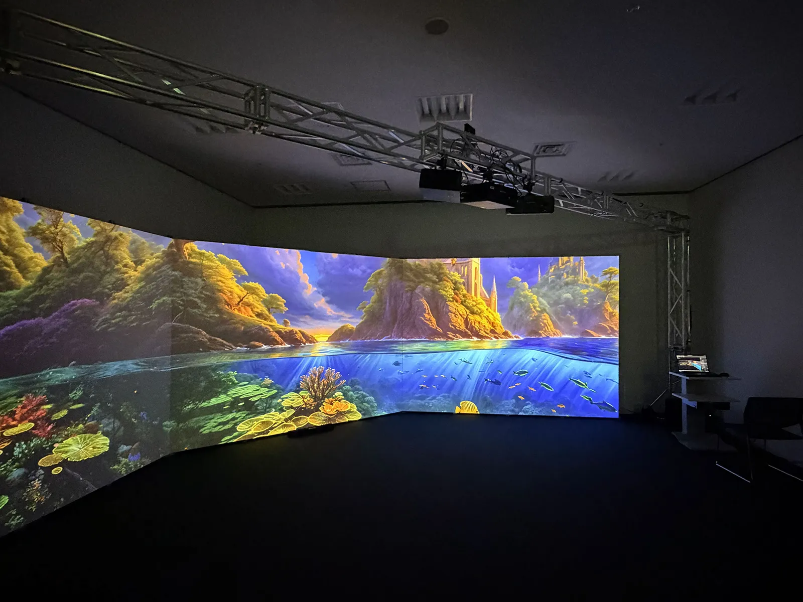ドーム映像、360度映像、VR映像などのコンテンツを多人数で気軽に楽しめるオリジナルの広視野ディスプレイシステムを提供しています。